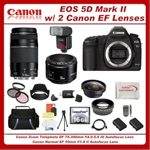 In stock. Canon EOS 5D Mark II with Canon EF 75-300mm III & Canon EF 50mm f/1.8 II Lenses: Including 16GB CF Card, Deluxe Carrying Case, 3 Piece Filter Kit, Card Reader & much much more...